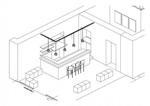 Progettazione di un bar a Torino, zona San Salvario. Attività svolte: progettazione definitiva, richiesta e ottenimento autorizzazioni al SUAP per l'apertura di una nuova attività commerciale, progettazione esecutiva degli spazi e dell'arredamento con disegno esecutivo su misura del bancone, direzione lavori. Nella progettazione degli spazi sono state sfruttate le due aperture esistenti tra i due vani, regolarizzandone le dimensioni: un varco mette in comunicazione le due sale, l'altro permette al barista di poter controllare e servire l'altra sala.