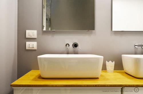 Il bagno padronale e il bagno della camera da letto diventano un tutt’uno tramite l’utilizzo del grigio, presente dalle pareti fino alle piastrelle, e tramite la luce naturale, che pervade il bagno padronale attraverso il vetro satinato posto a ridosso della doccia.