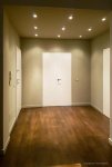 L’ingresso diventa una sorta di scatola accogliente attraverso il colore caldo e il gioco di faretti.